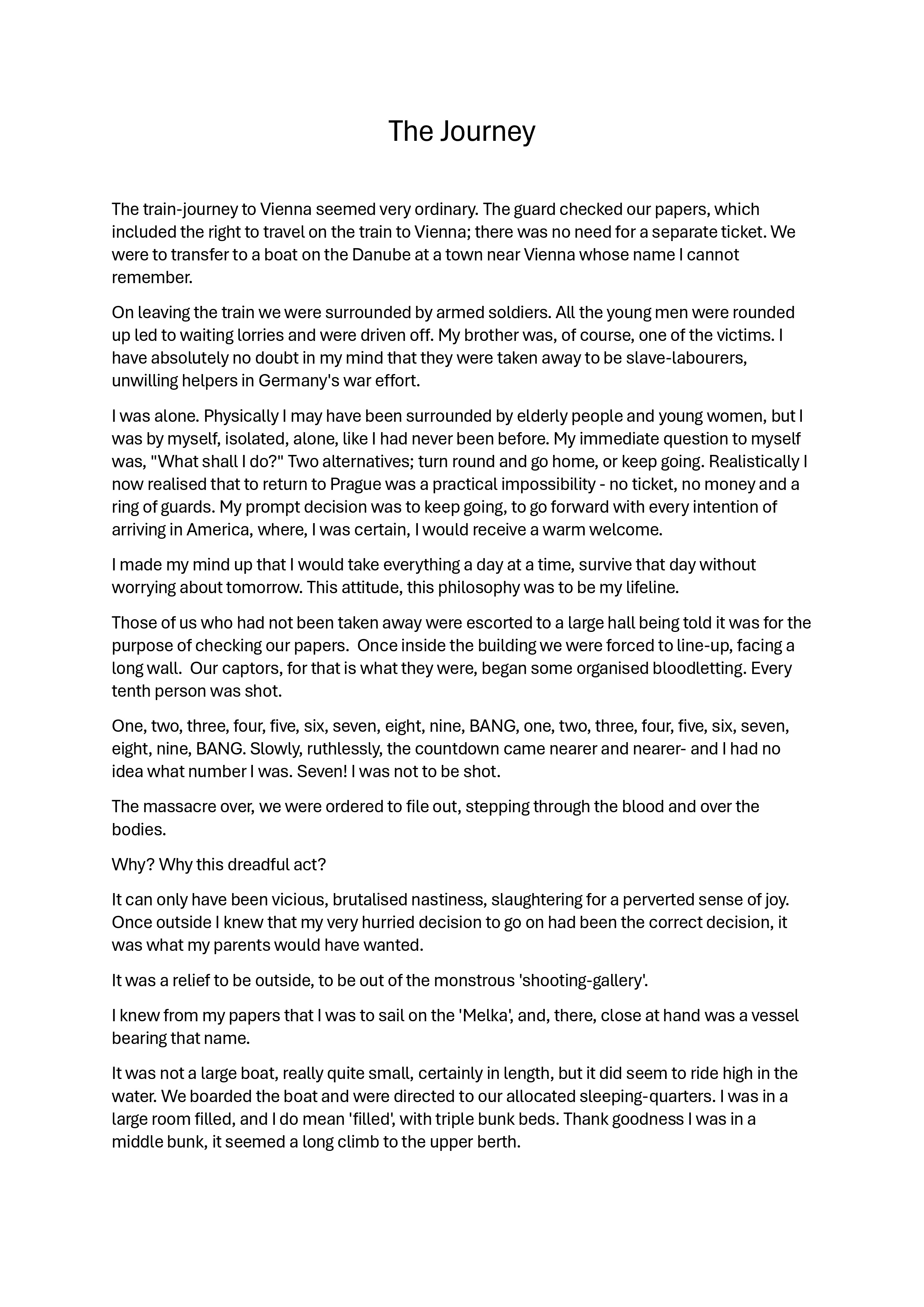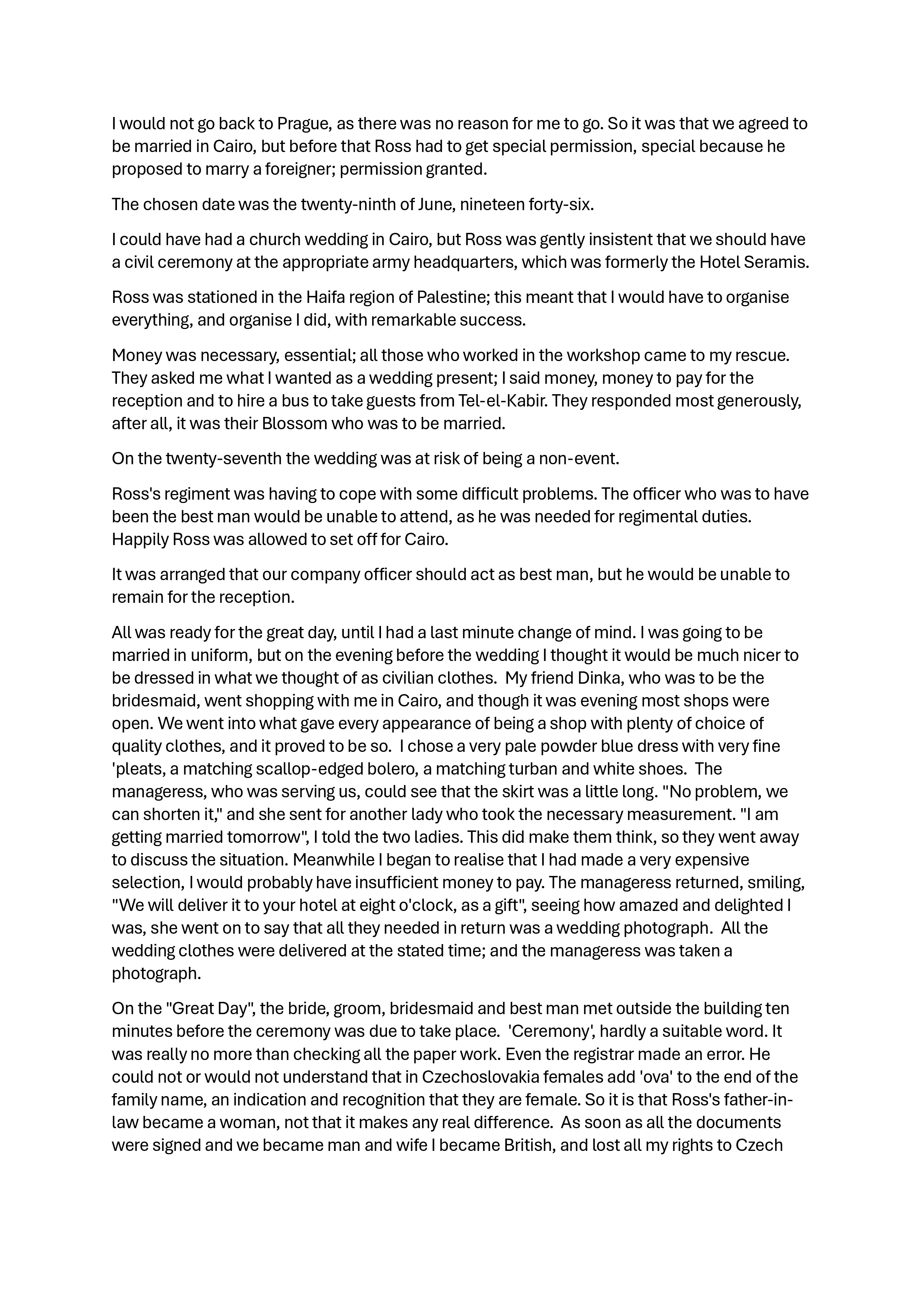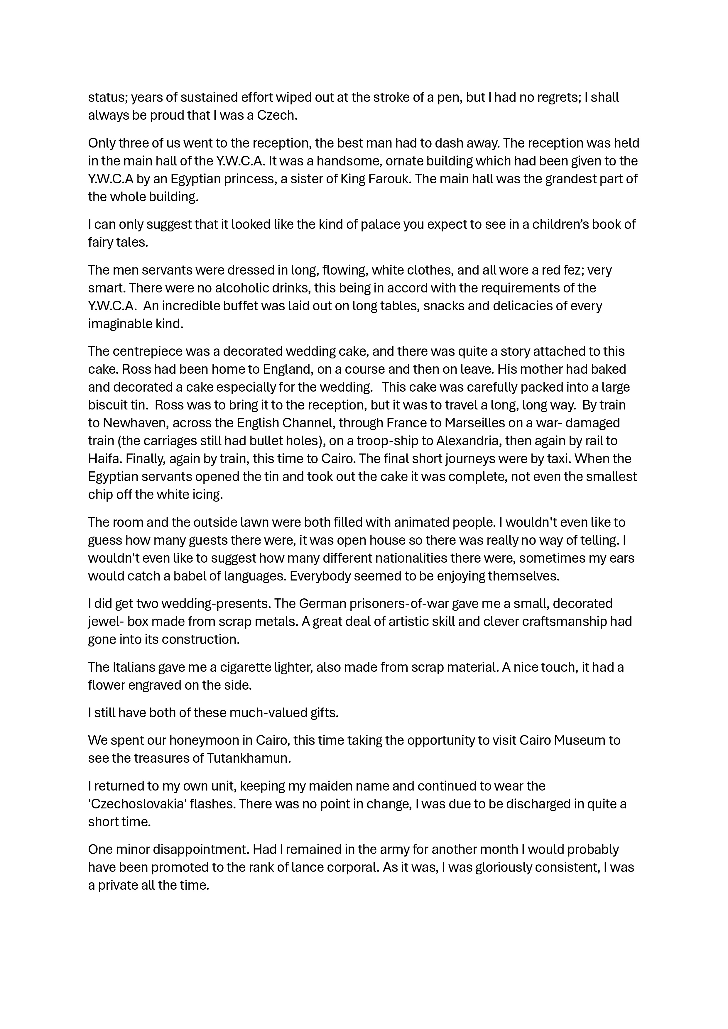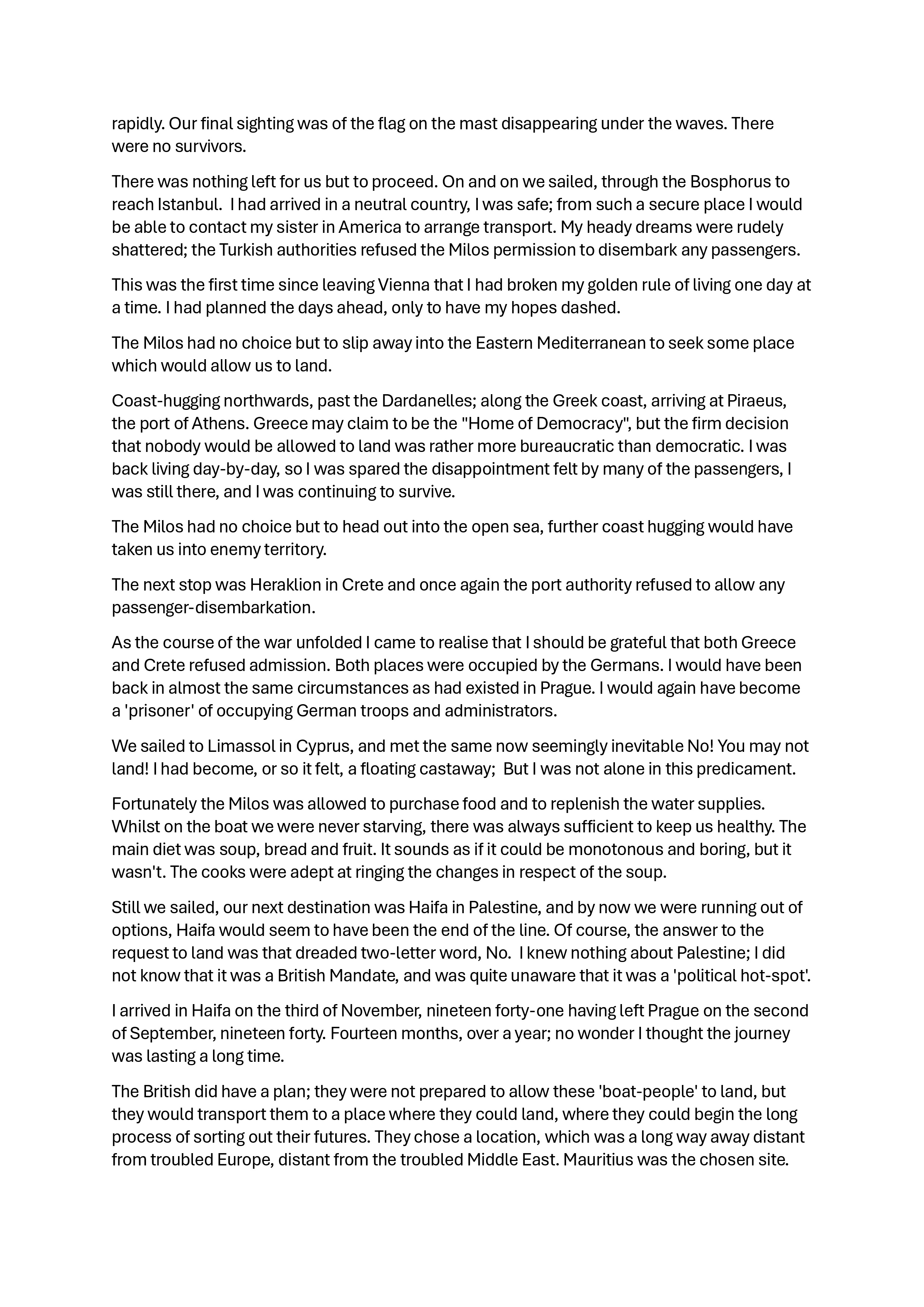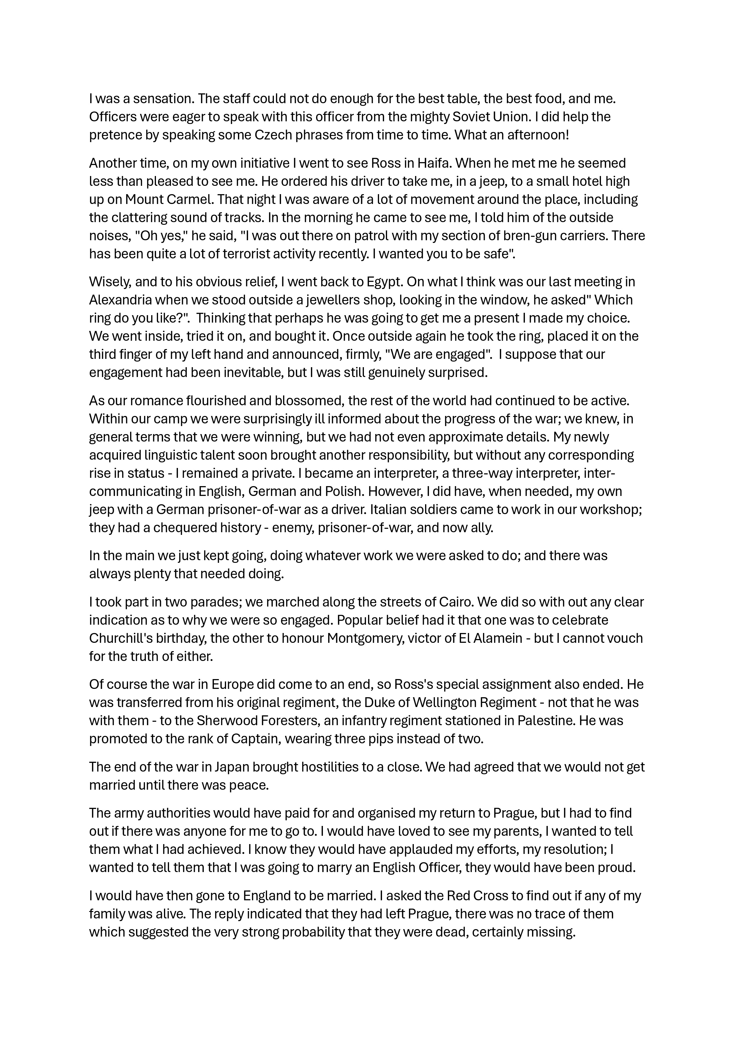 Vzpomínky na dětství a mládí strávené na tehdejší Podkarpatské Rusi a později v Praze, na cestu z Prahy do Haify v roce 1940/1941, na působení v pomocném sboru britské armády v Palestině (ATS) a na poválečný rodinný život ve Velké Británii.