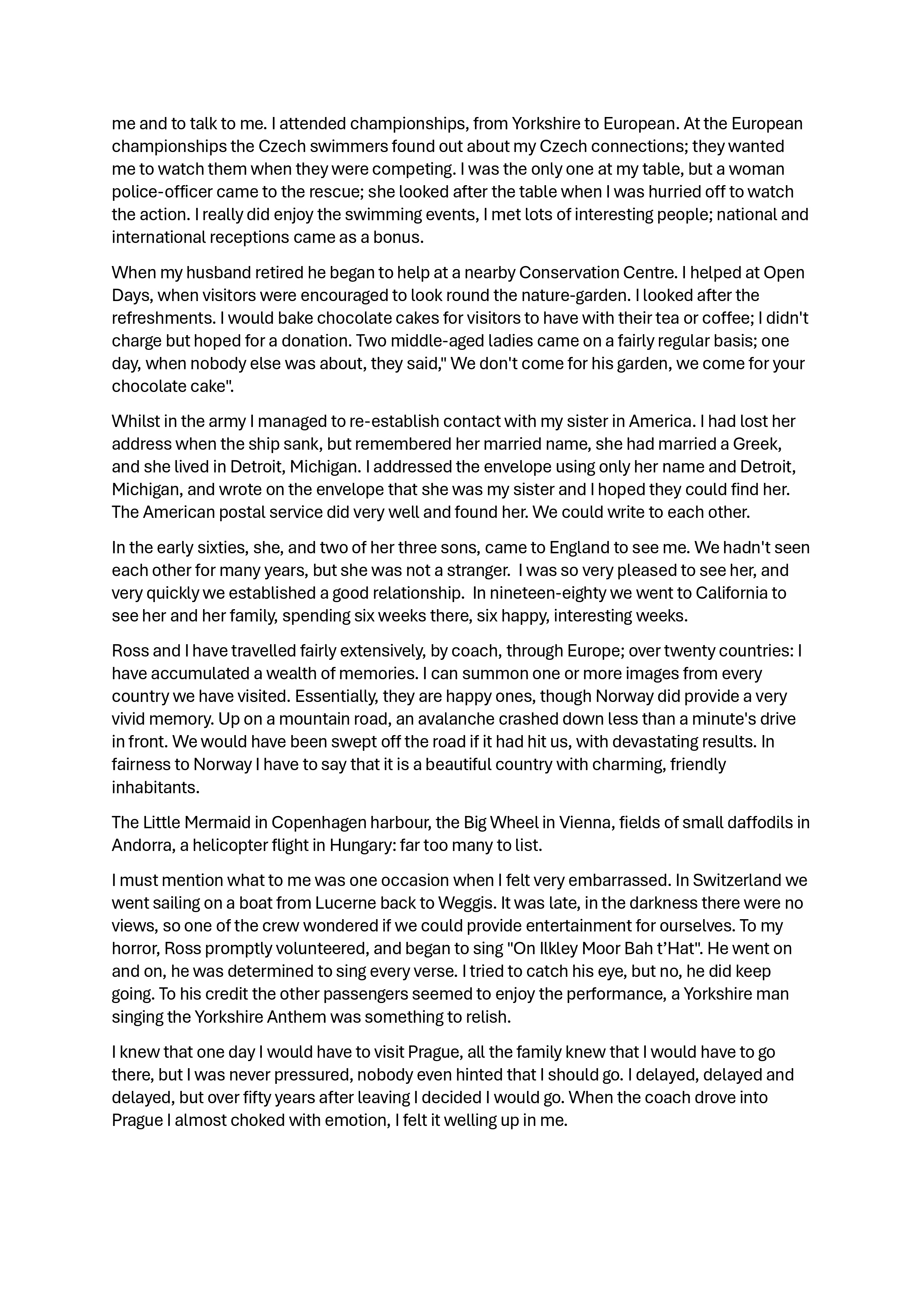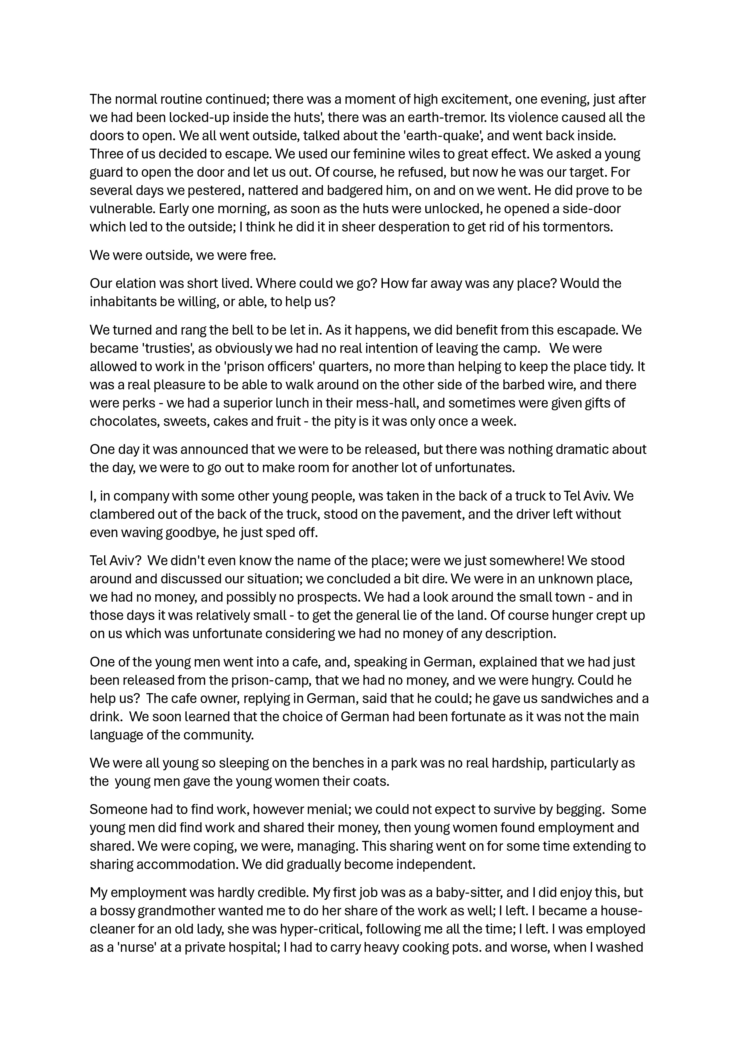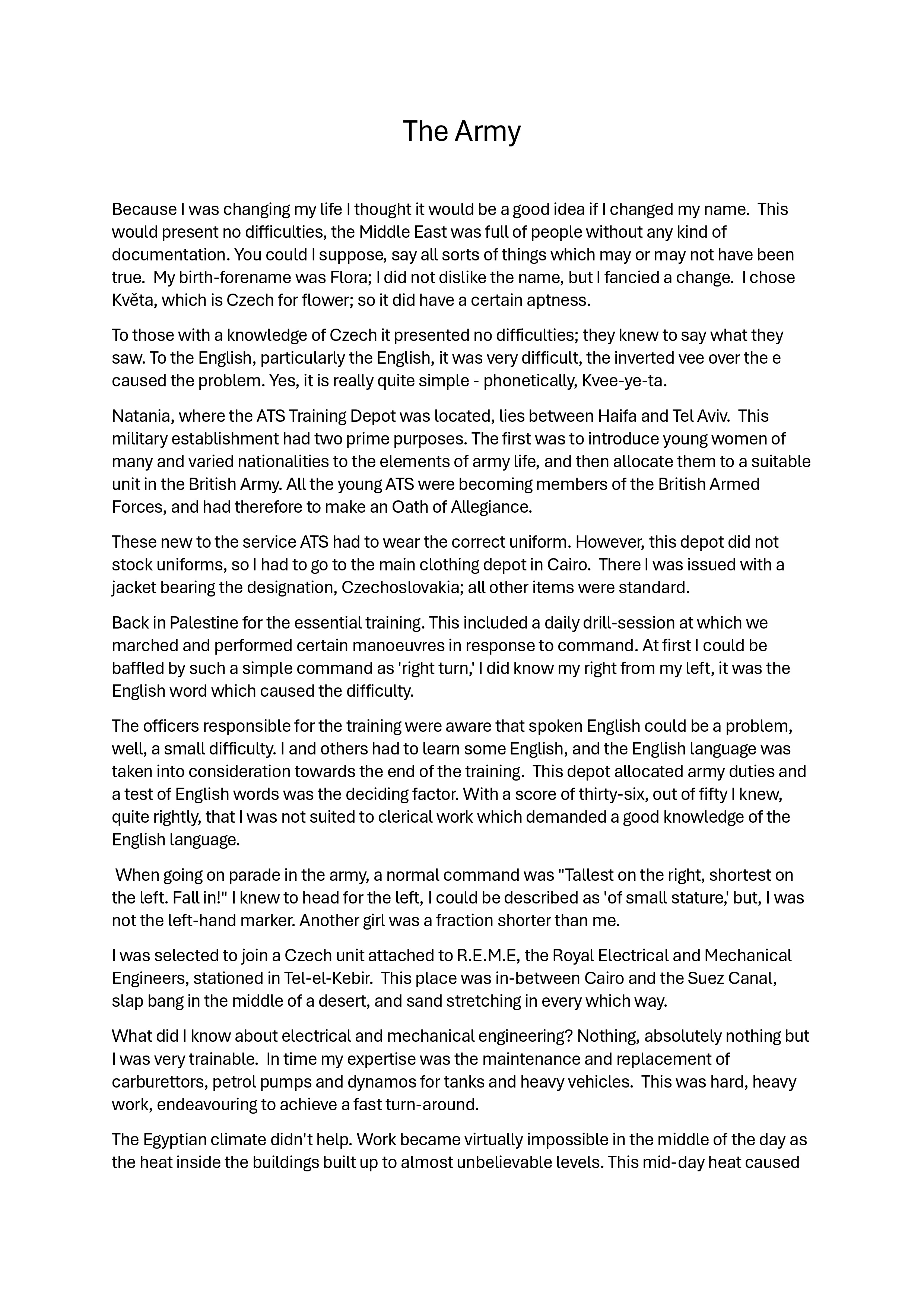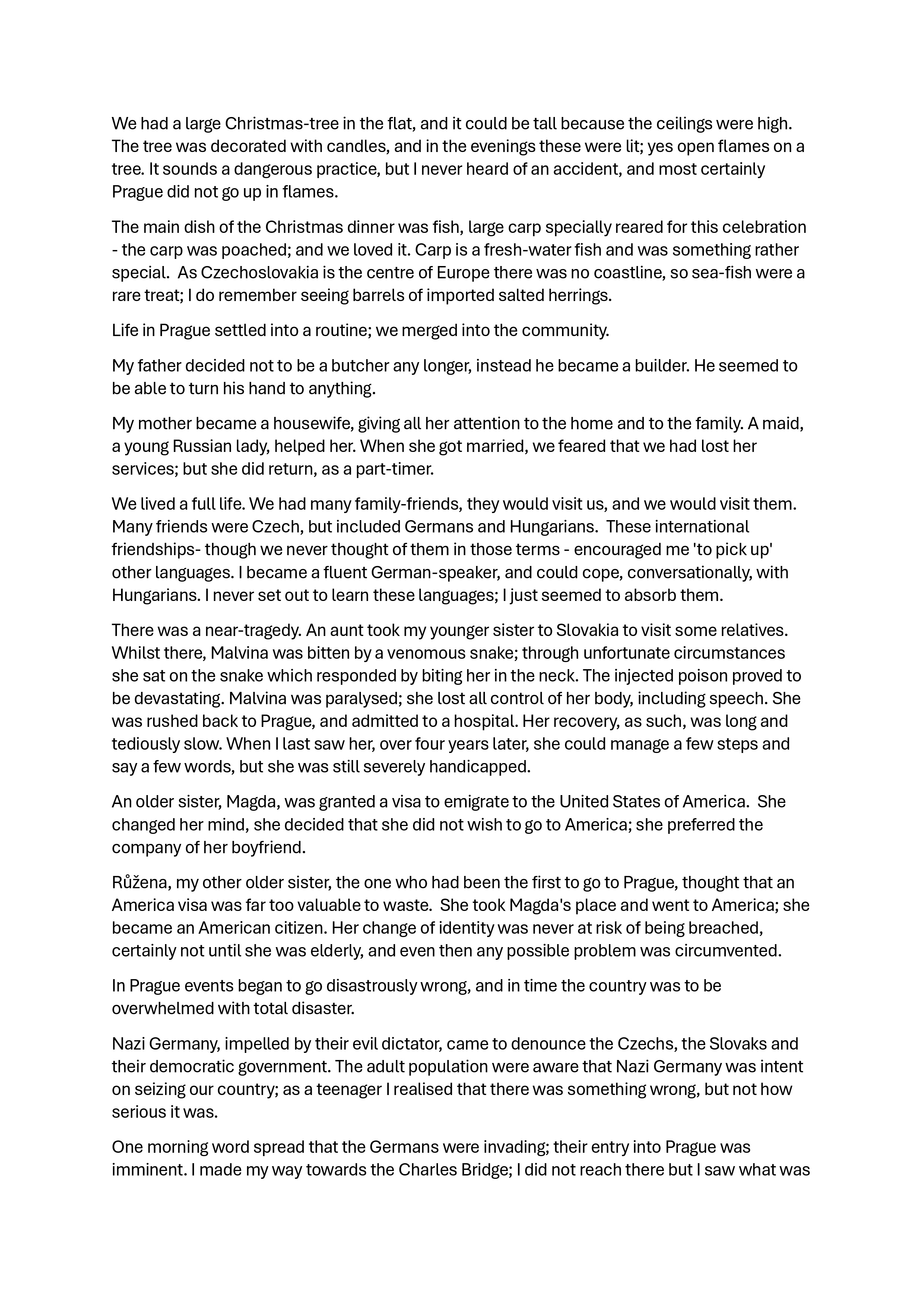 Vzpomínky na dětství a mládí strávené na tehdejší Podkarpatské Rusi a později v Praze, na cestu z Prahy do Haify v roce 1940/1941, na působení v pomocném sboru britské armády v Palestině (ATS) a na poválečný rodinný život ve Velké Británii.