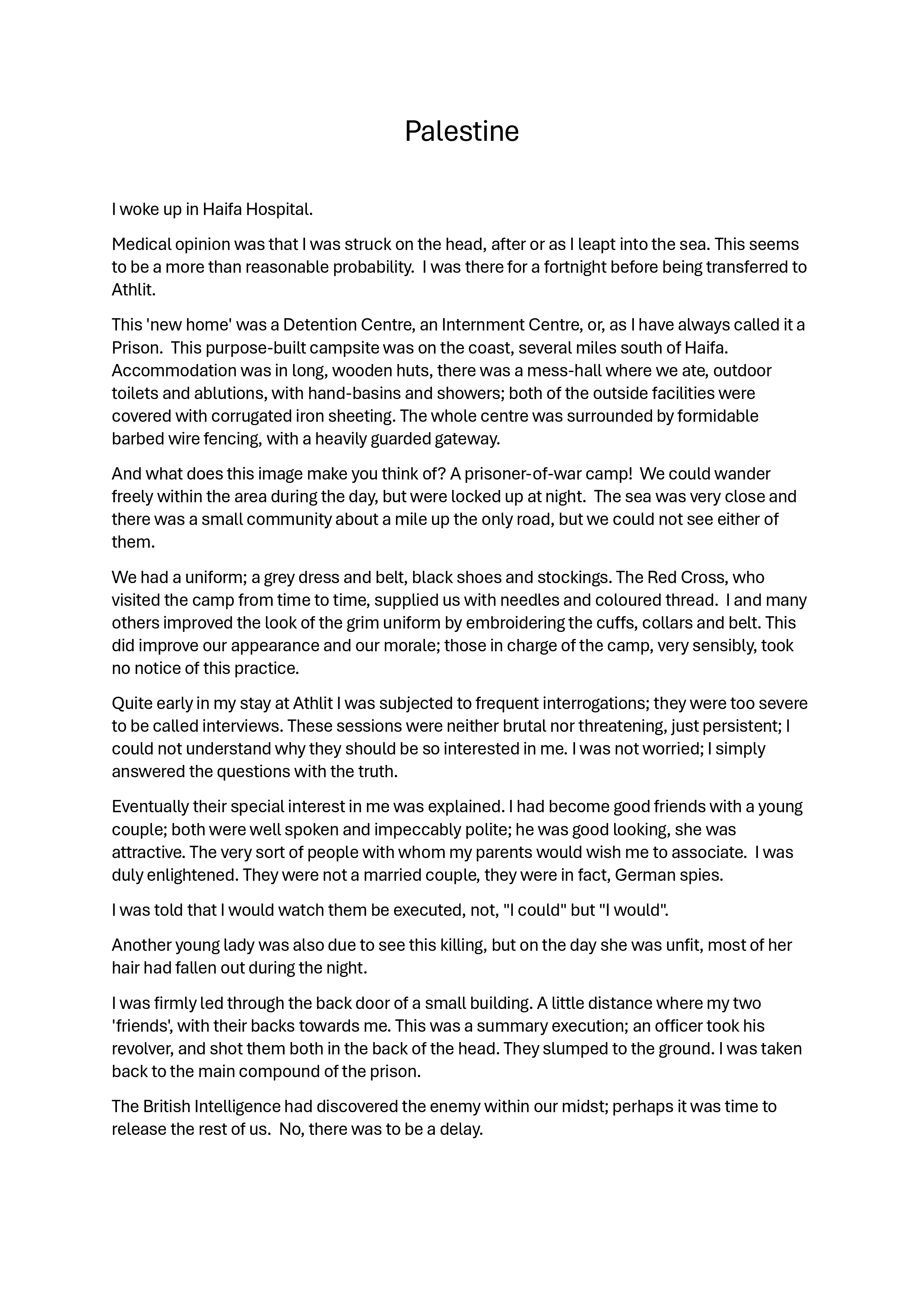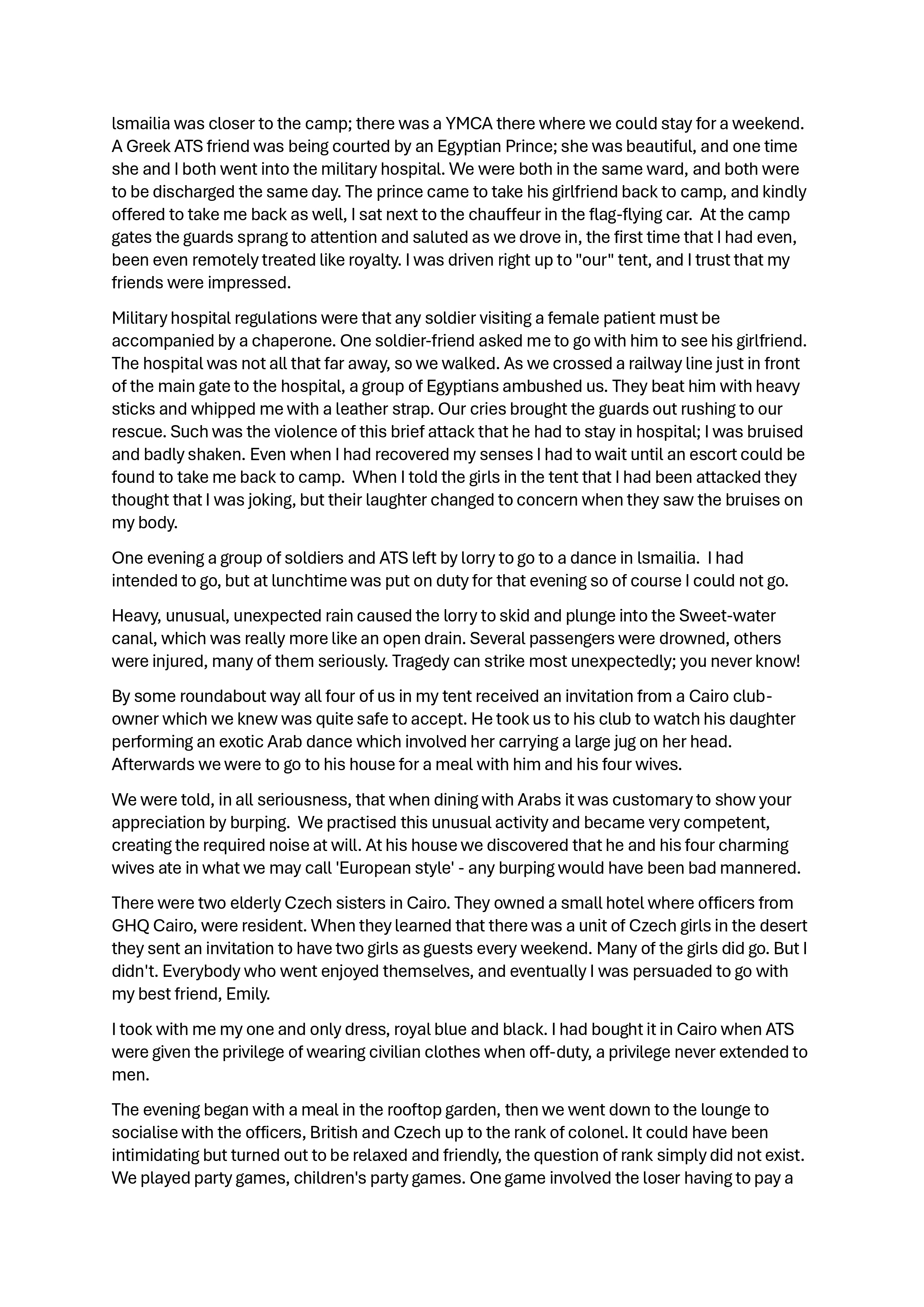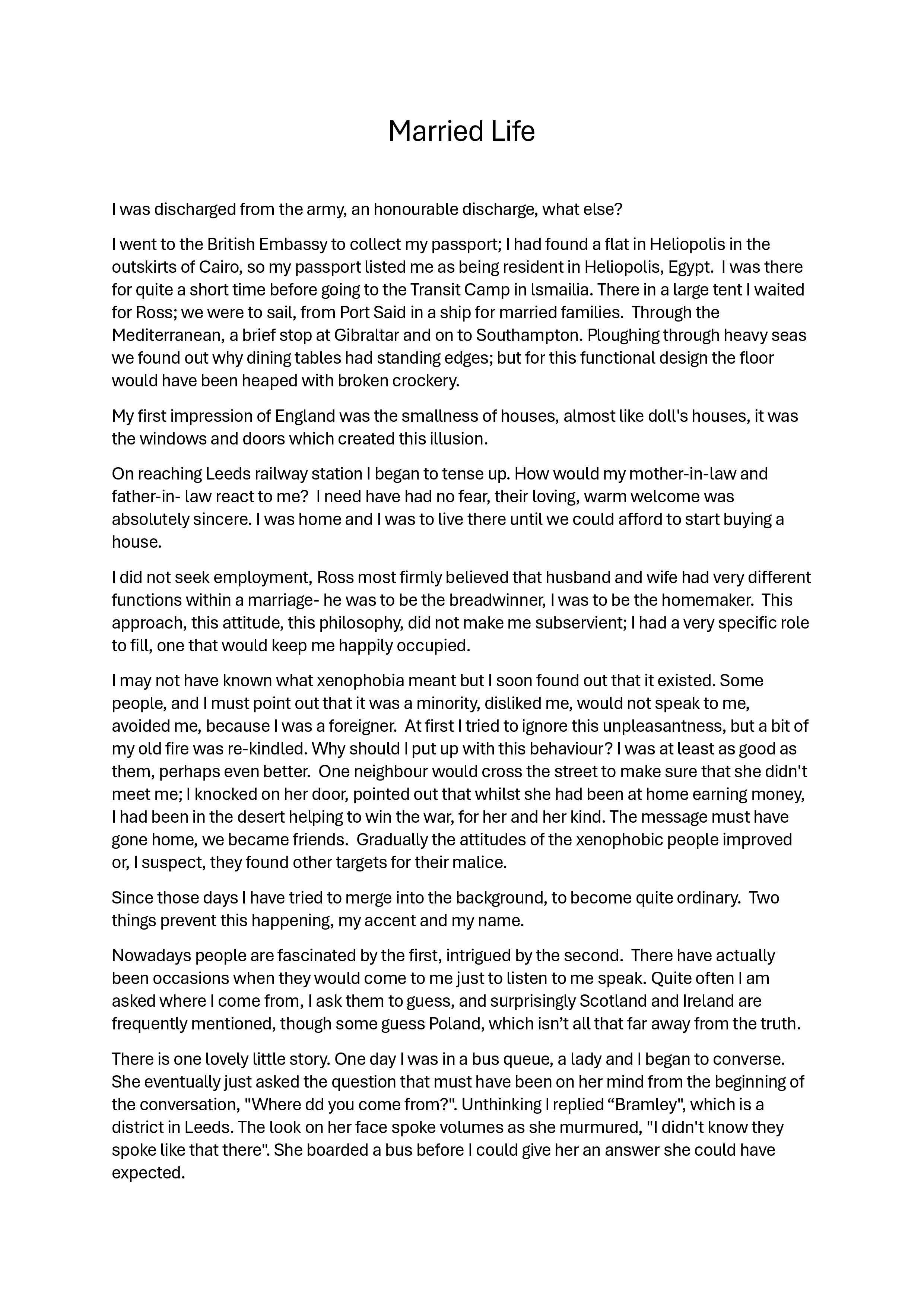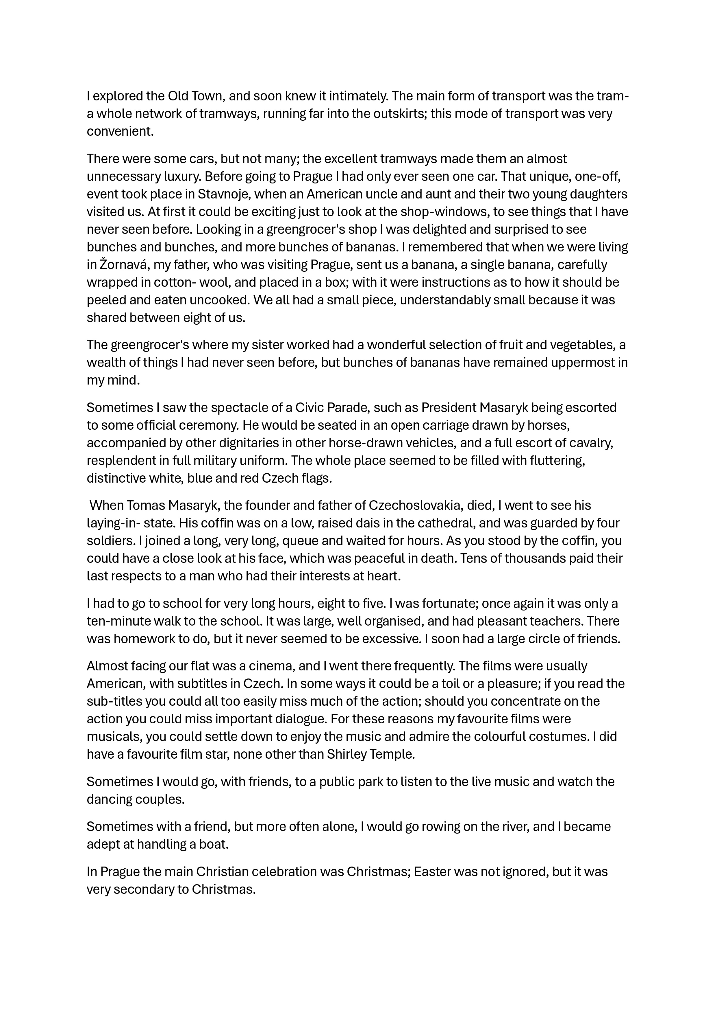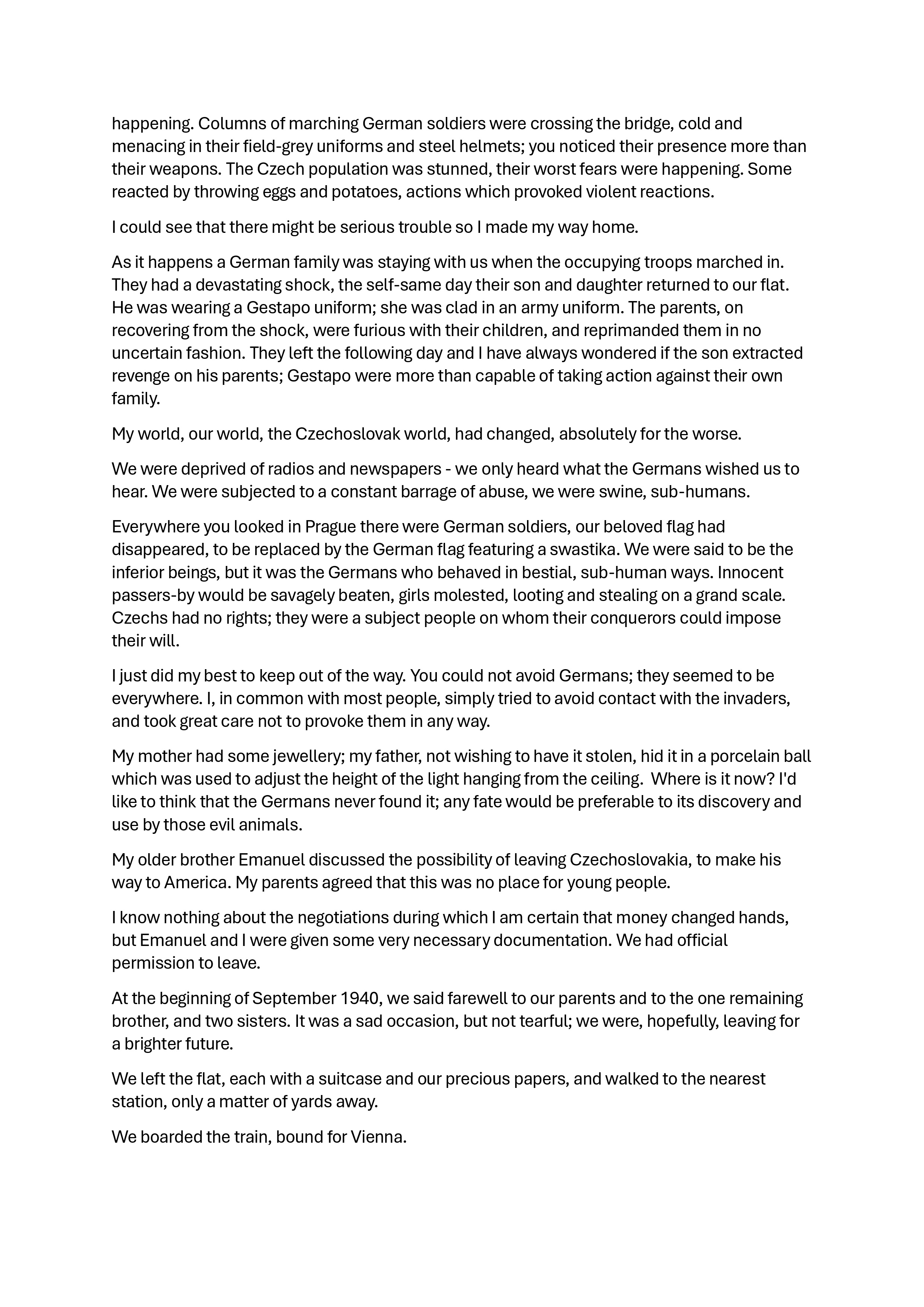 Vzpomínky na dětství a mládí strávené na tehdejší Podkarpatské Rusi a později v Praze, na cestu z Prahy do Haify v roce 1940/1941, na působení v pomocném sboru britské armády v Palestině (ATS) a na poválečný rodinný život ve Velké Británii.