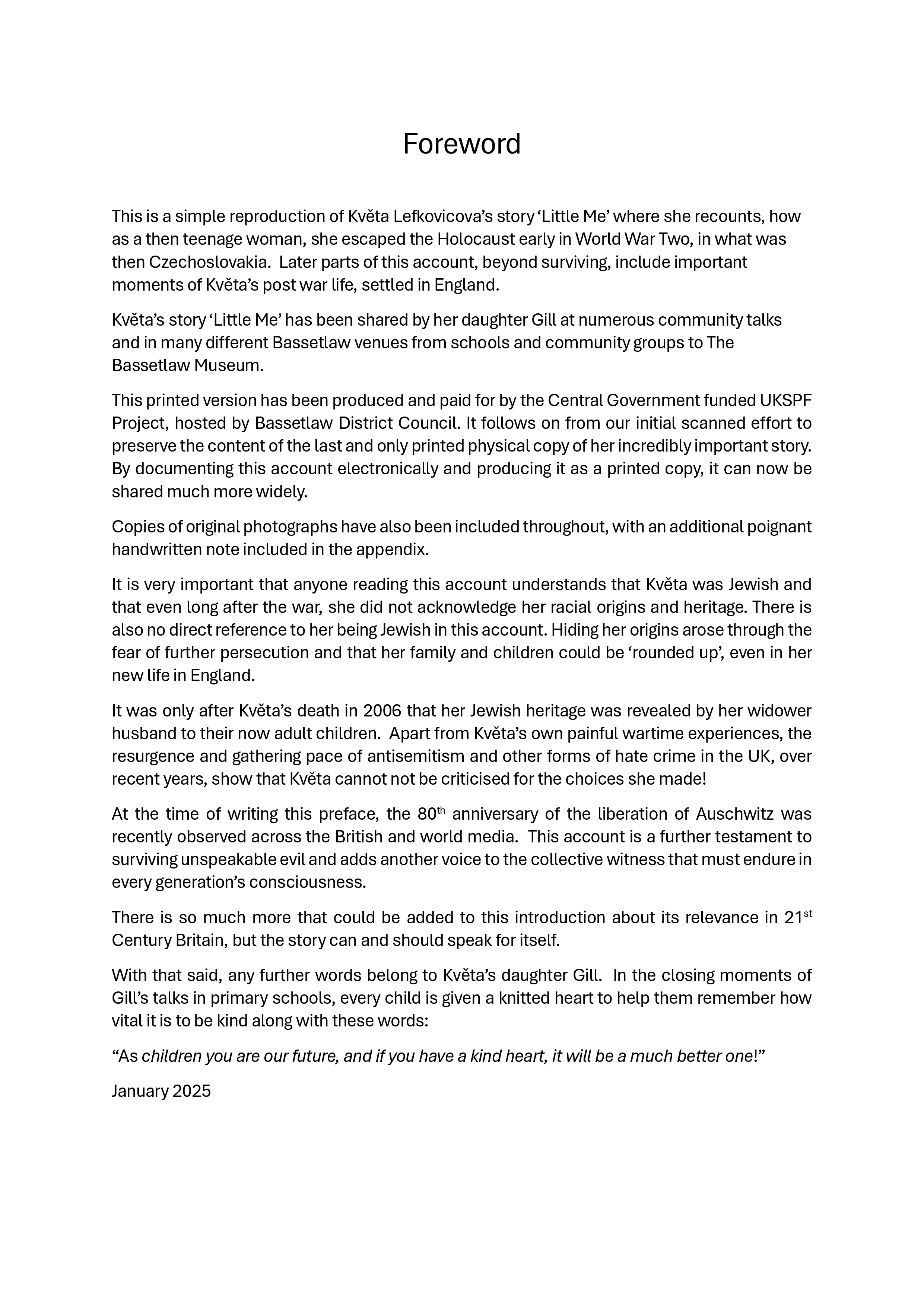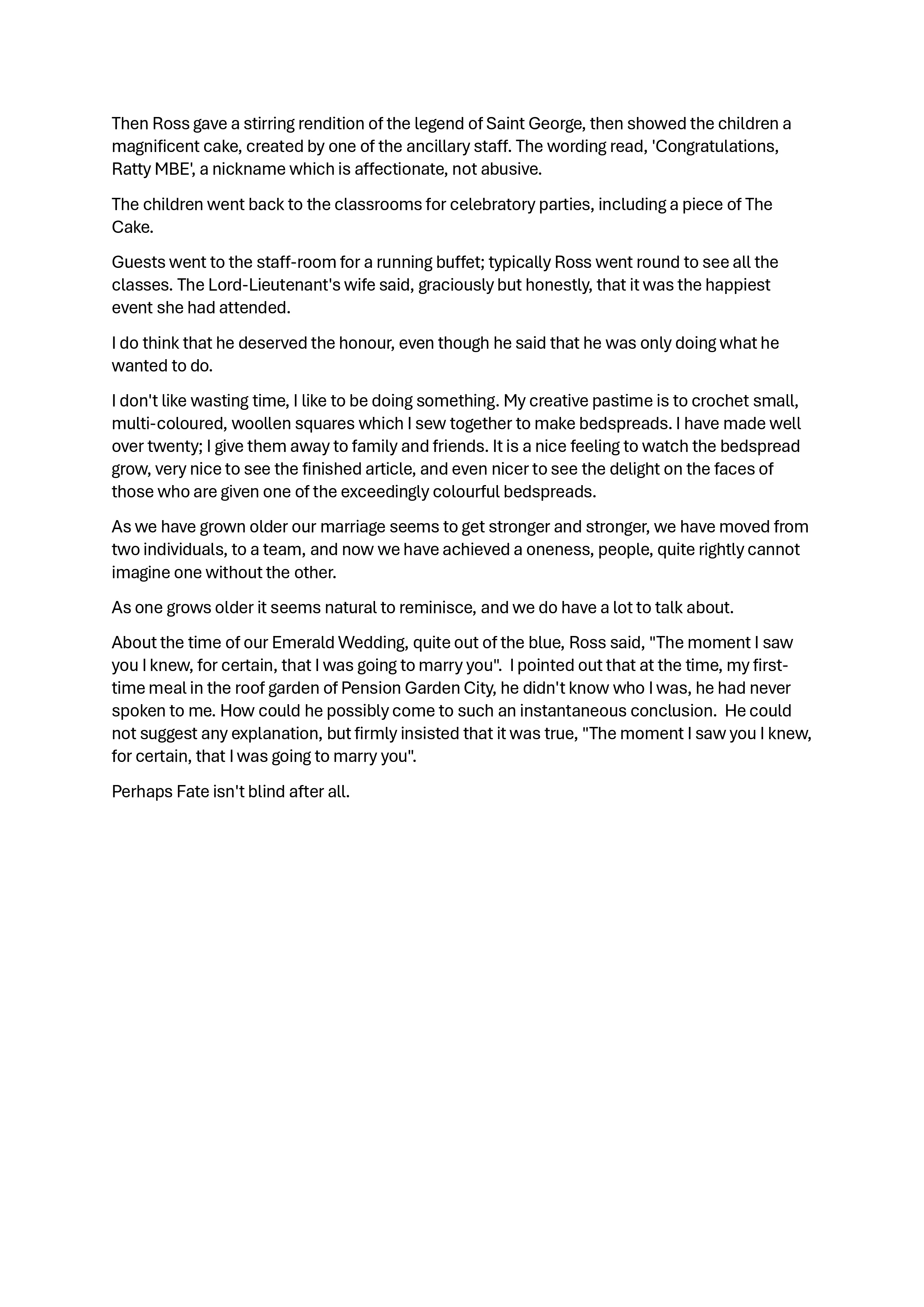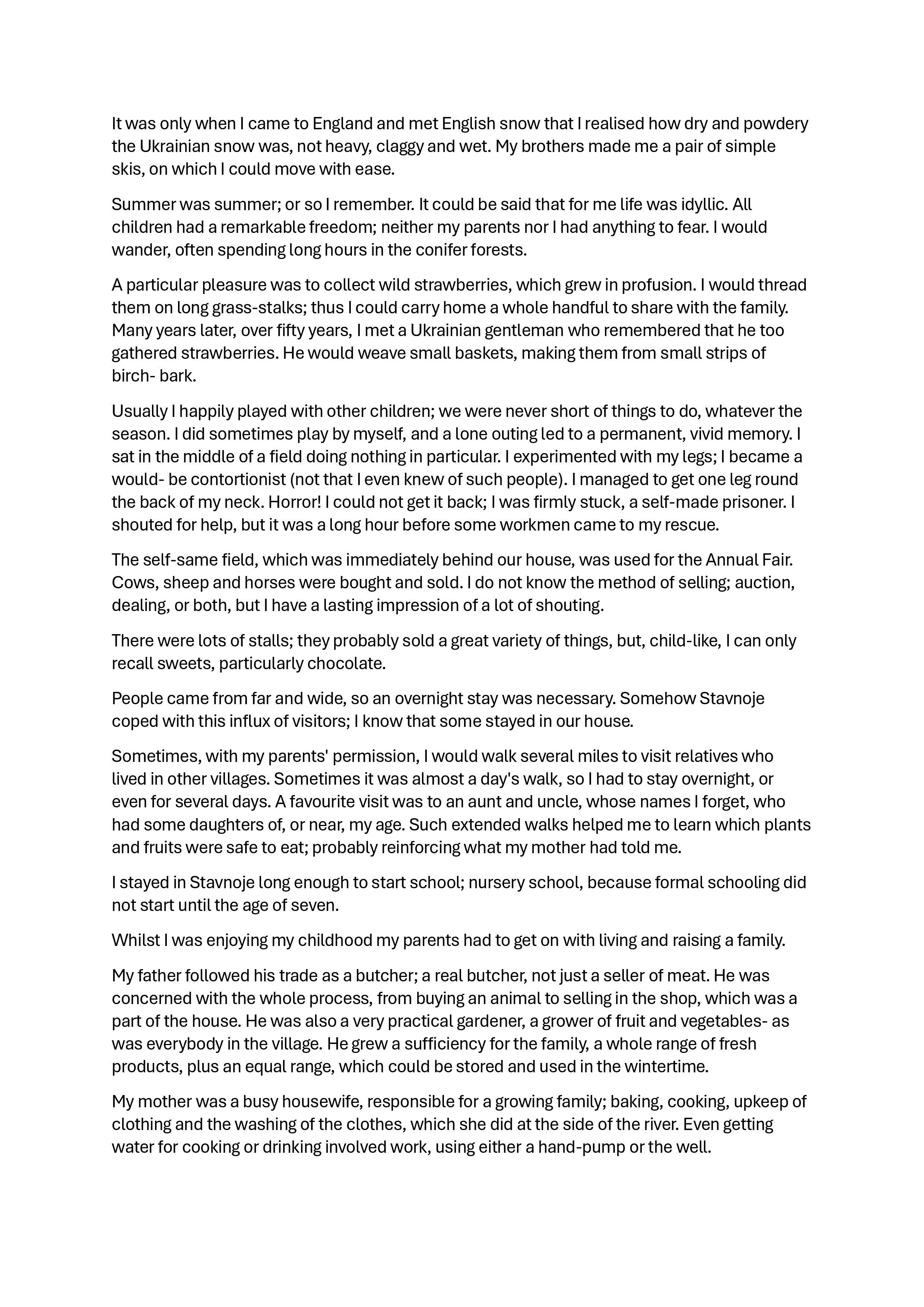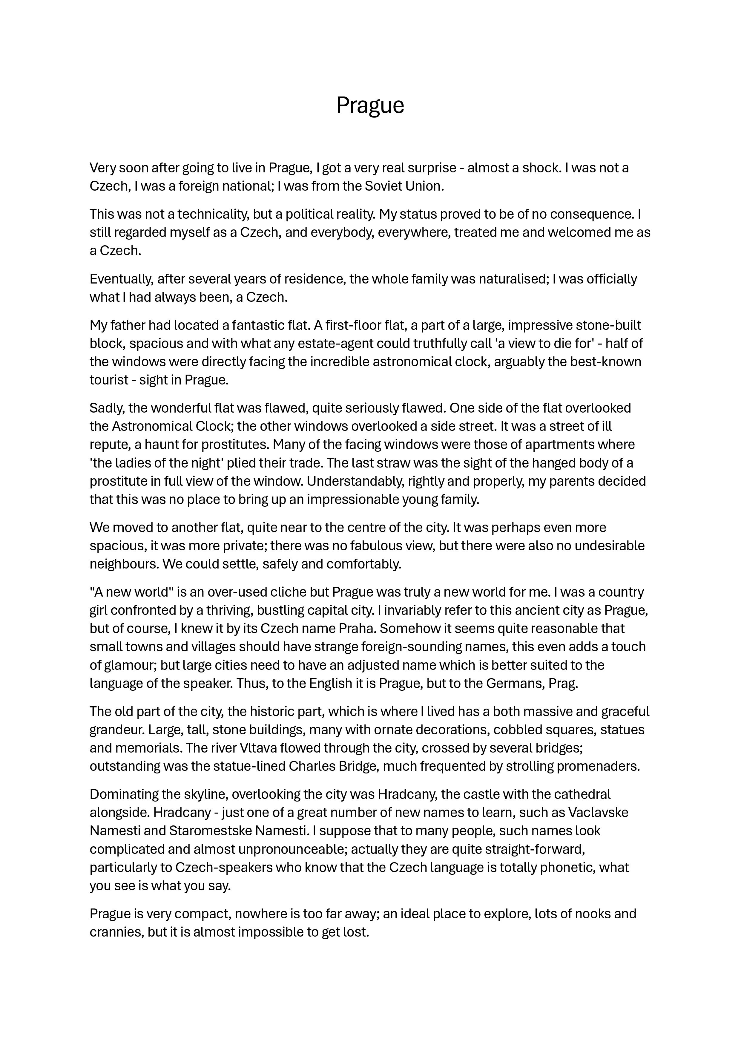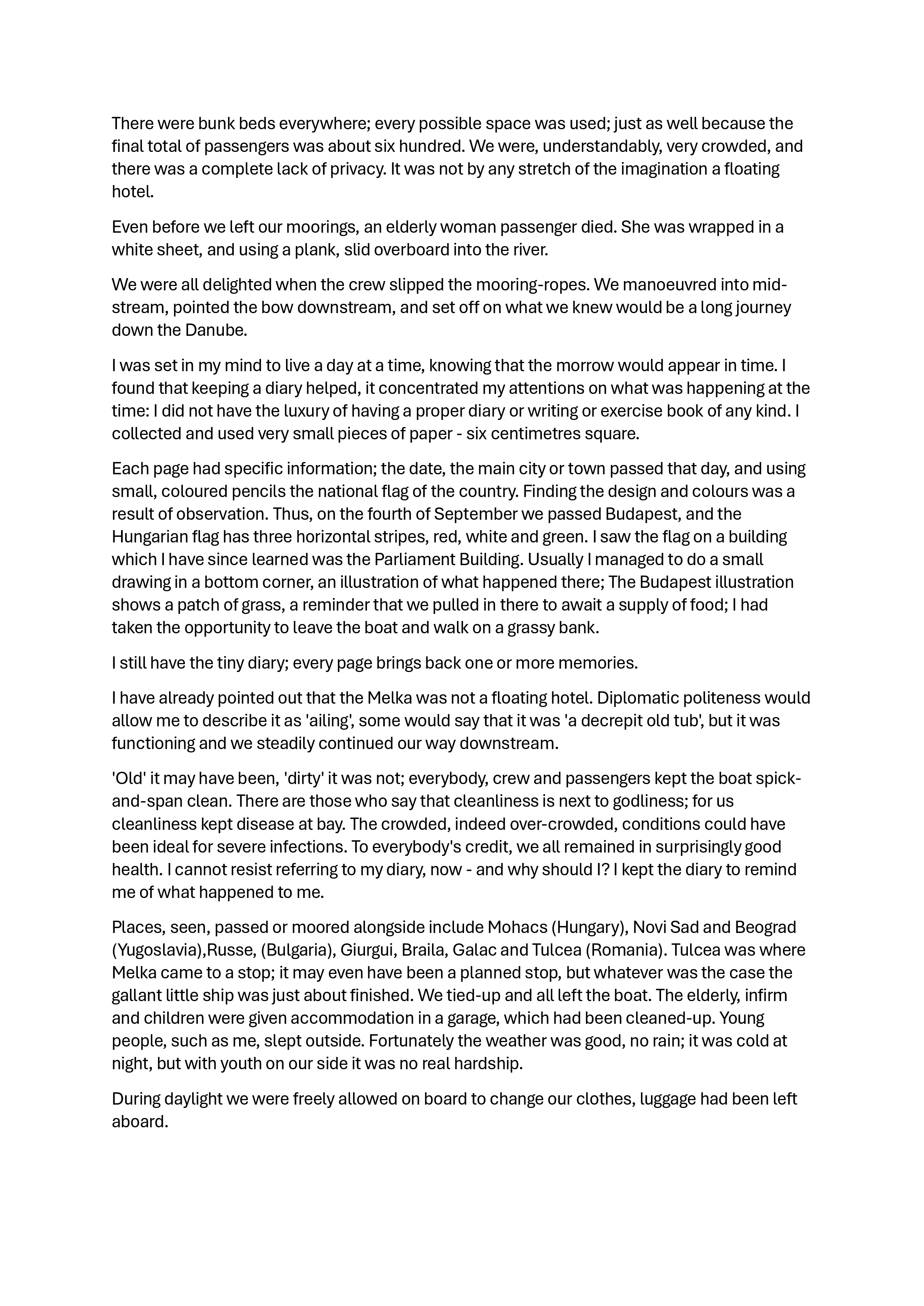 Vzpomínky na dětství a mládí strávené na tehdejší Podkarpatské Rusi a později v Praze, na cestu z Prahy do Haify v roce 1940/1941, na působení v pomocném sboru britské armády v Palestině (ATS) a na poválečný rodinný život ve Velké Británii.